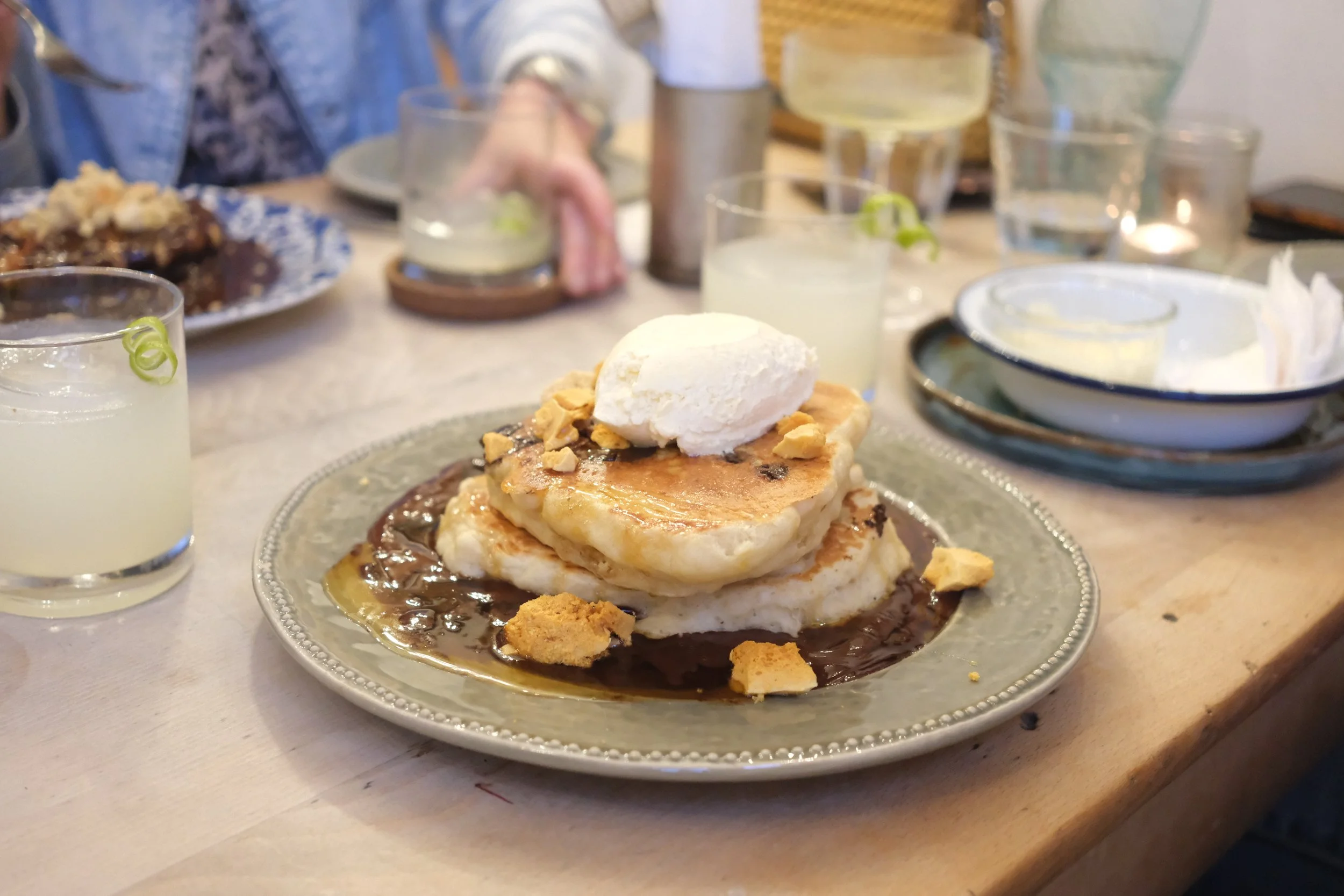 Chocolate chip pancakes, honeycomb, dark chocolate sauce, chantilly